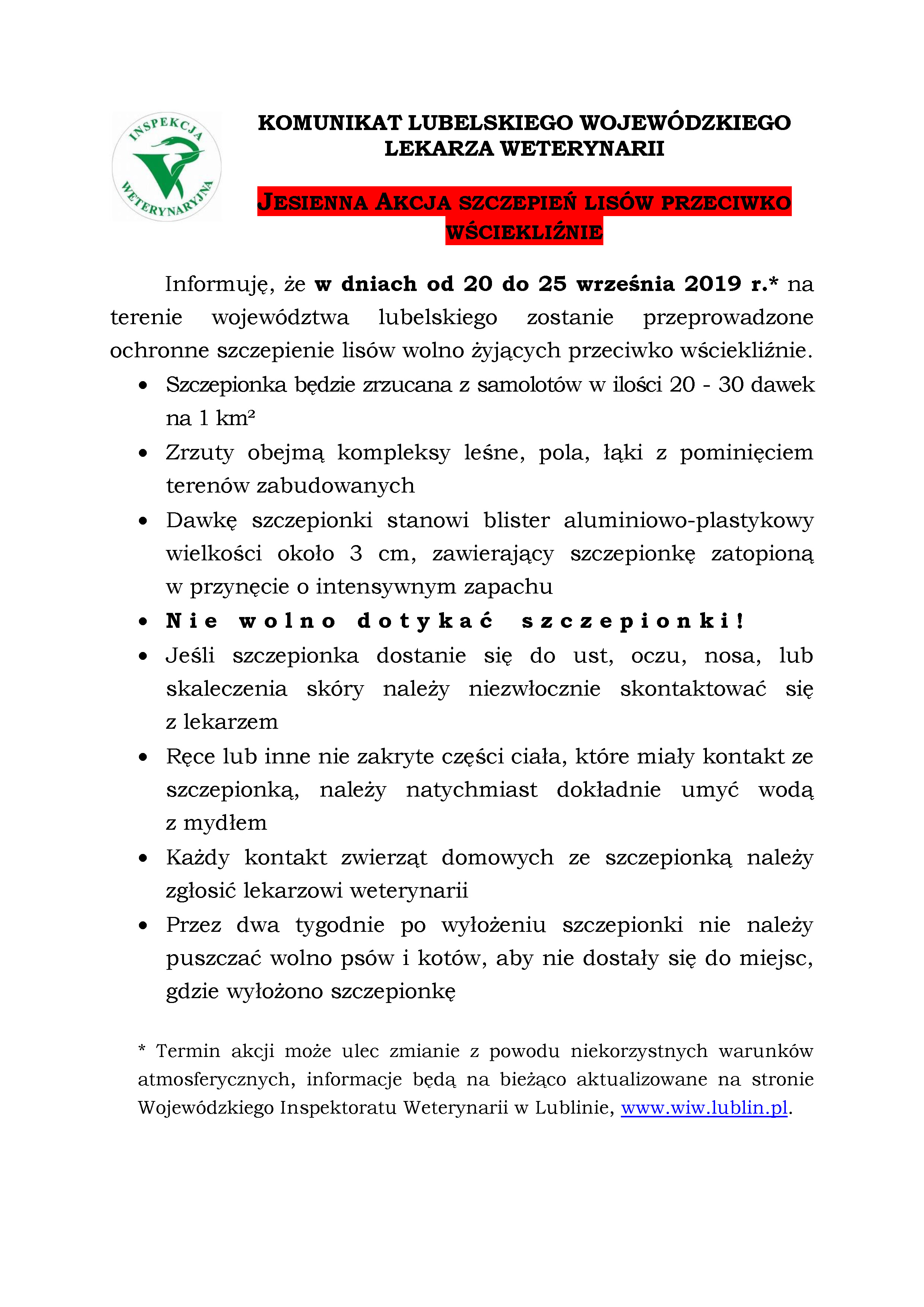 Jesienna akcja szczepień lisów przeciwko wściekliźnie 20-25.09.2019r.