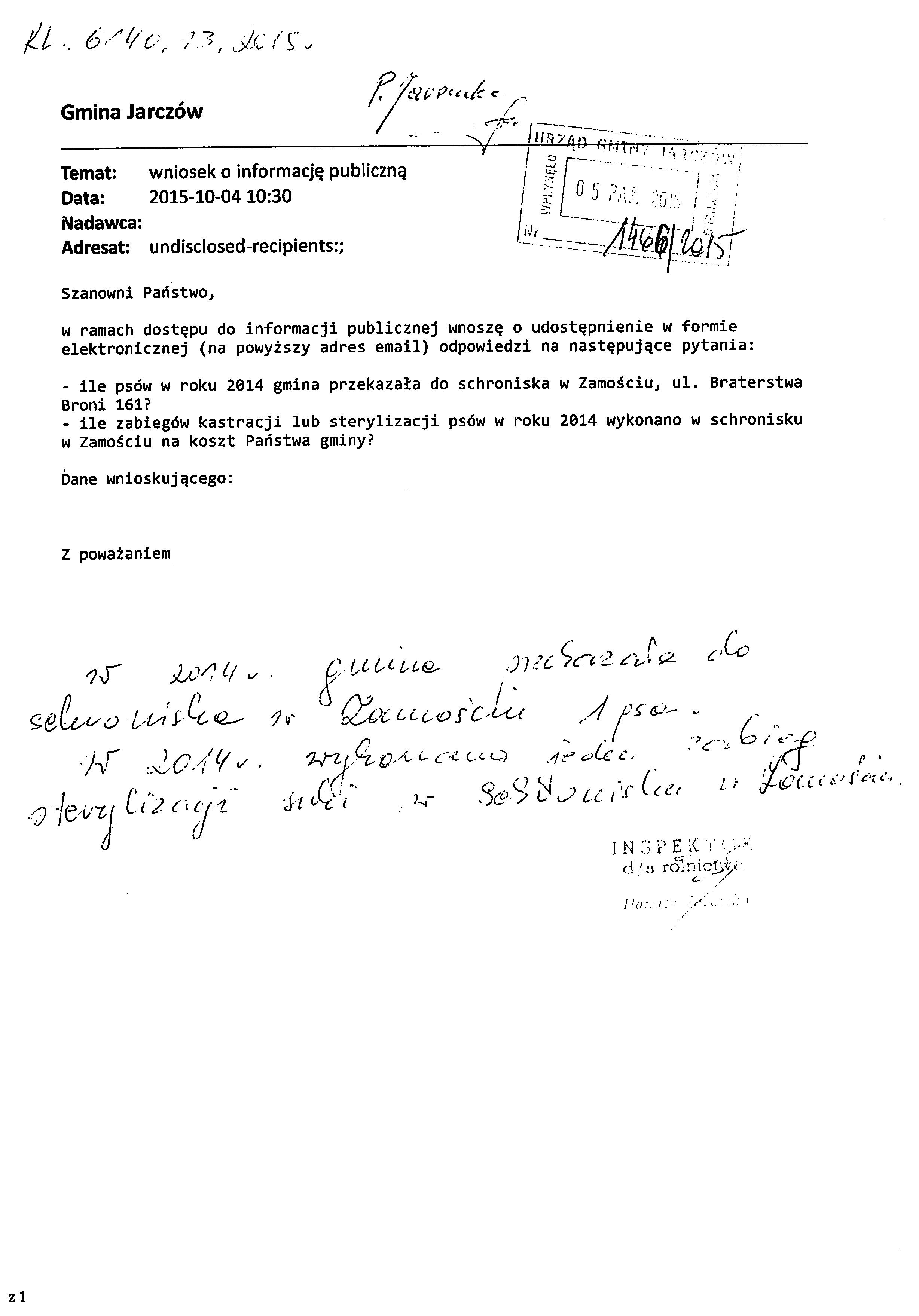 Wniosek o udostępnienie informacji publicznej w zakresie bezpańskich psów