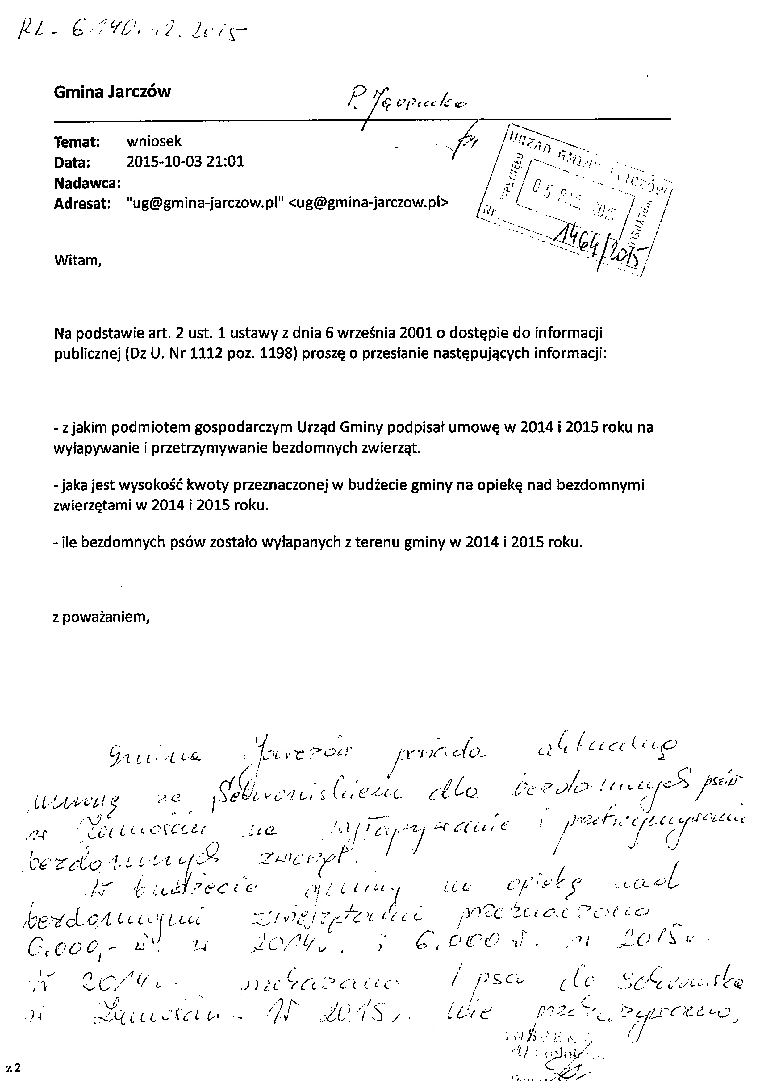 Wniosek o udostępnienie informacji publicznej w zakresie bezdomnych zwierząt
