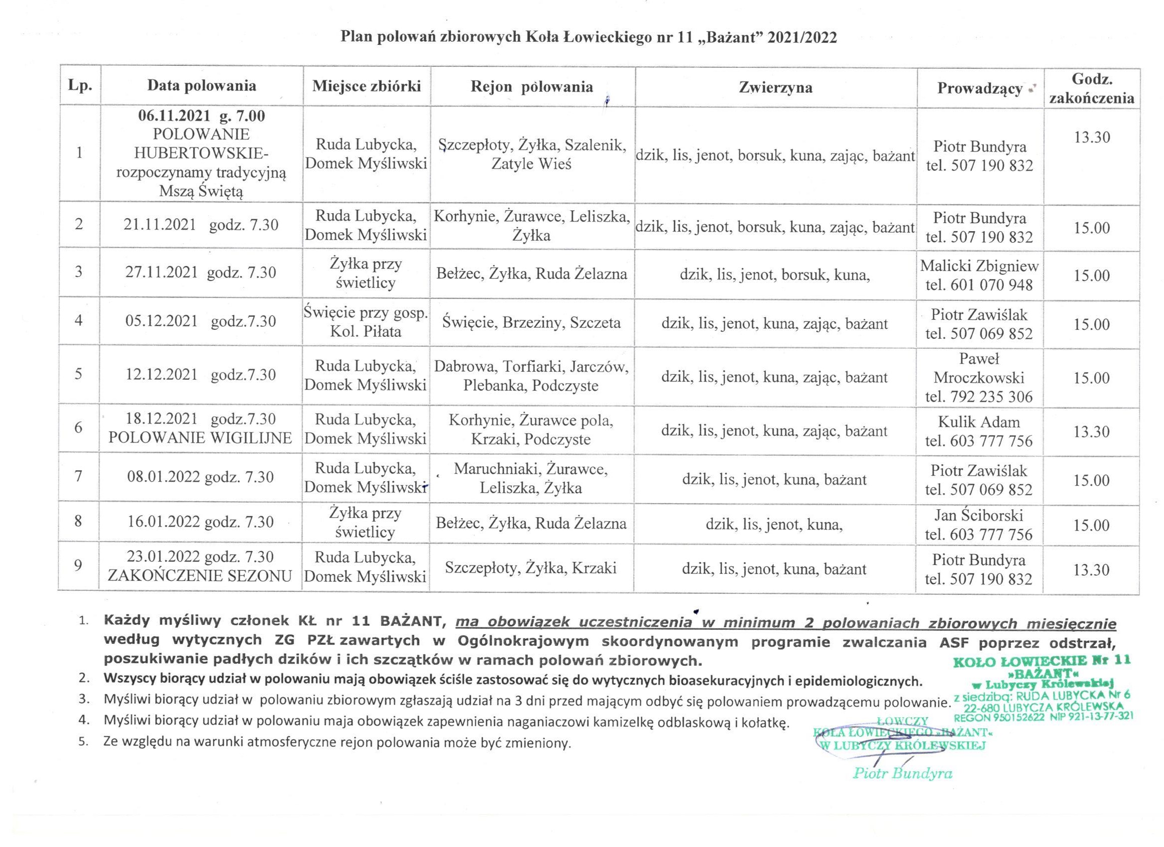 Plan polowań zbiorowych w sezonie łowieckim 2021/2022 prowadzonych przez Koło Łowieckie Nr 11 " Bażant"
