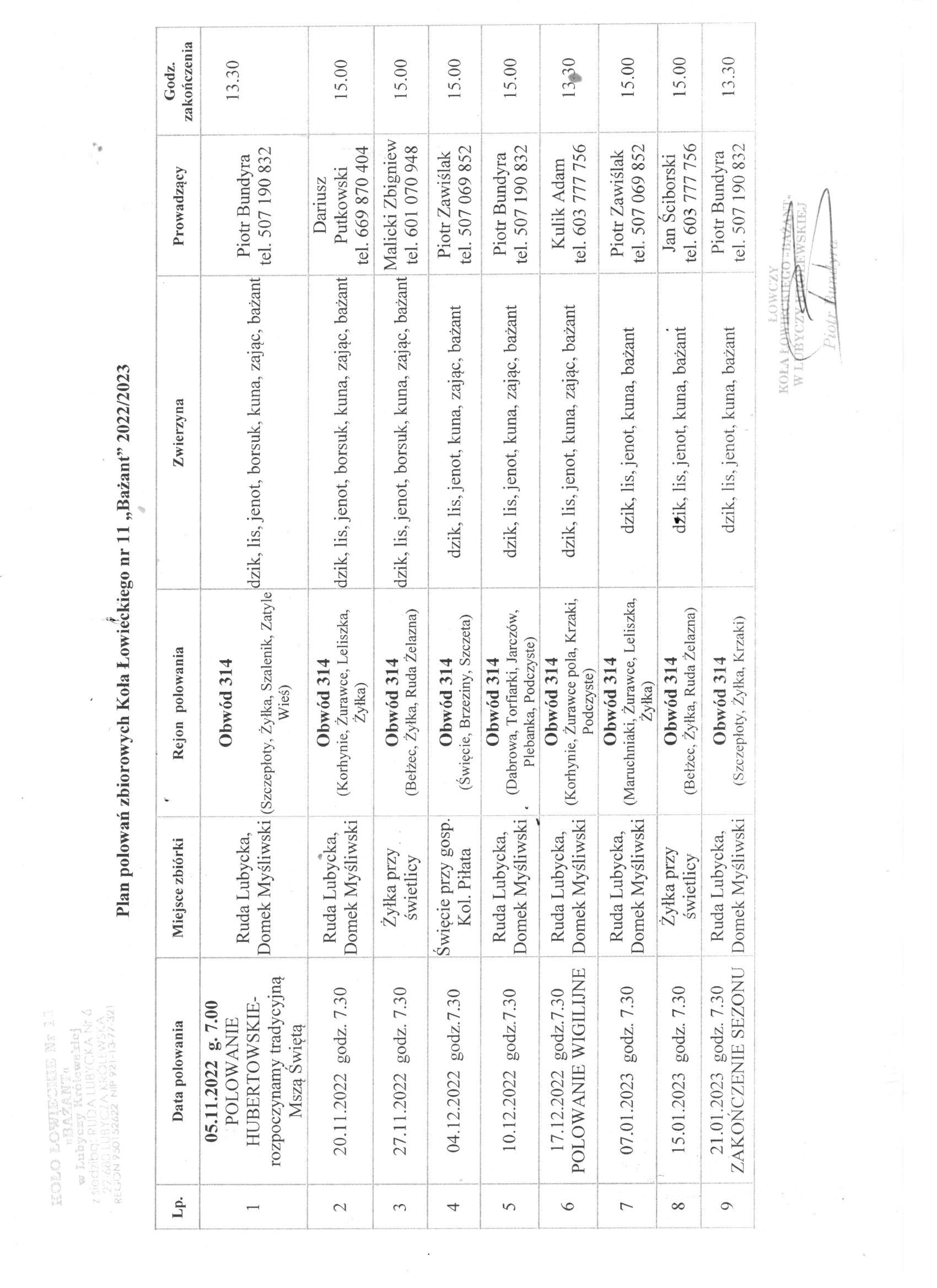 Plan polowań zbiorowych w sezonie łowieckim 2021/2022 prowadzonych przez Koło Łowieckie Nr 11 " Bażant"
