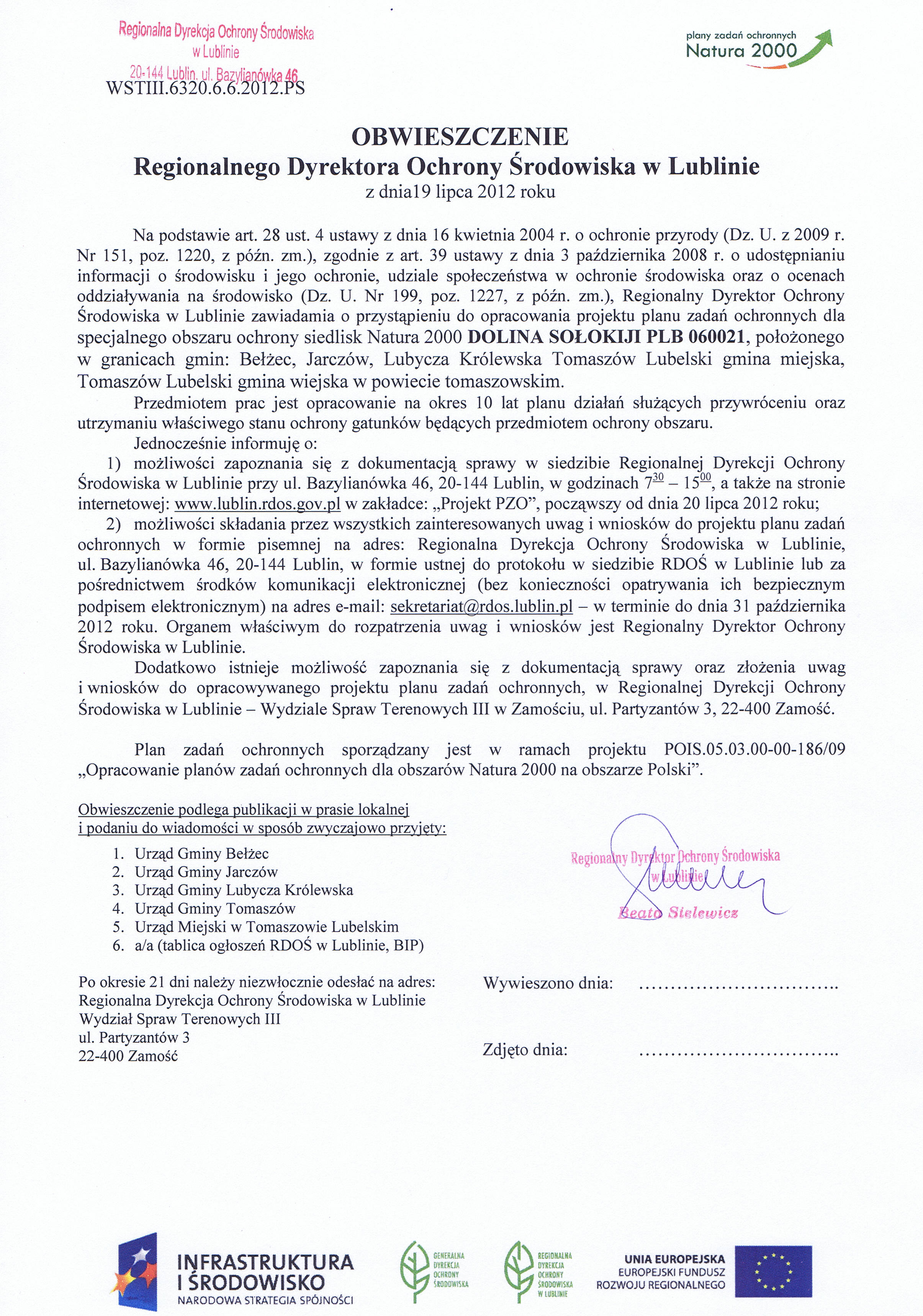 Obwieszczenia Regionalnego Dyrektora Ochrony Środowiska w Lublinie